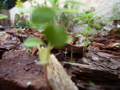 déjese caer, cortando el aire con la hoja, planeando sobre la gravilla y la corteza del jardín,